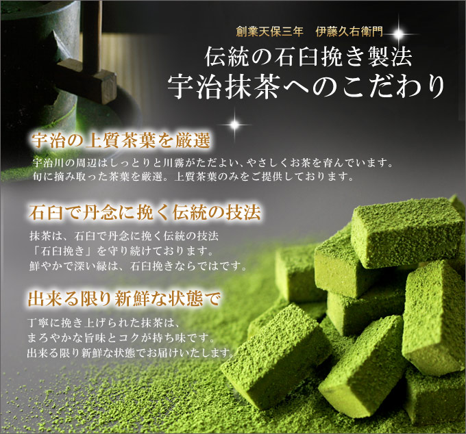 チョコレートは、石臼で弾いた宇治抹茶と厳選されたホワイトチョコレートのコラボです。